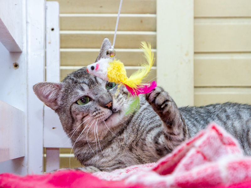 Use uma varinha de brinquedo: Isso cria uma ponte segura para interagir sem invadir o espaço pessoal do bichano.